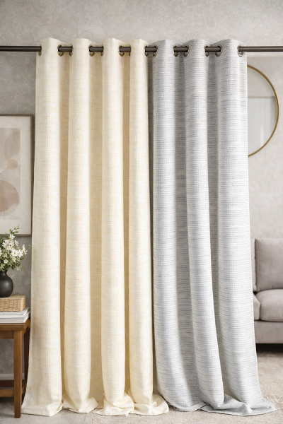 שילוב הצבעים הייחודי – שמנת־אפור ושמנת־בז’ – יוצר מראה רגוע, מאוזן ומעודן, שמתאים בקלות לסלון, לחדר שינה או לפינת אוכל. הווילון מאפשר לאור הטבעי לחדור בעדינות, תוך שמירה על תחושת פרטיות ואווירה חמימה.